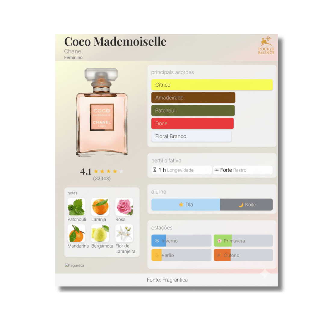 COCO MADEMOISELLE Eau de Parfum é um perfume ambarado, uma fragrância enérgica e voluptuosa. Centelhas de laranja fresca e vibrante imediatamente despertam os sentidos. Um coração claro e sensual revela os acordes transparentes de jasmim e rosa. O rastro desdobra as nuances de patchouli e vetiver que enfatizam a estrutura esguia da composição.